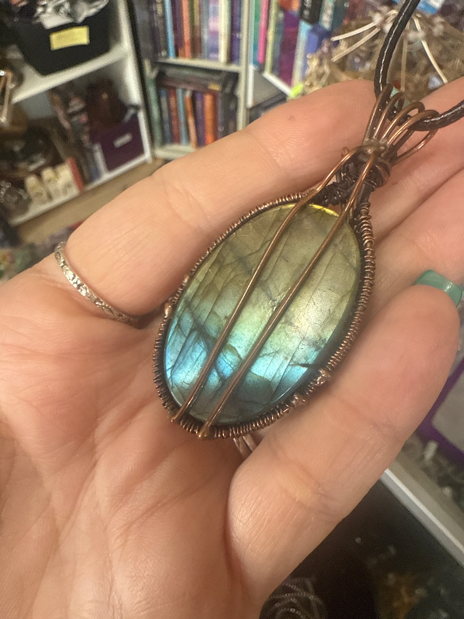 A Labradorite wire wrapped pendant is a pendant made from a Labradorite stone that has been wrapped in copper wire. The stone is known for its unique play of colors, with a range of shades of blue, green, and yellow, and is believed to be a powerful crystal for self-discovery and inner transformation, promoting intuition and spiritual insight.